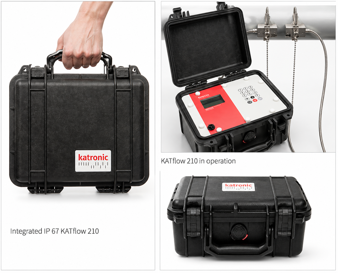 Sistema de medición ultrasónica KATflow 210 de Katronic en carcasa protectora IP67 para condiciones extremas.
